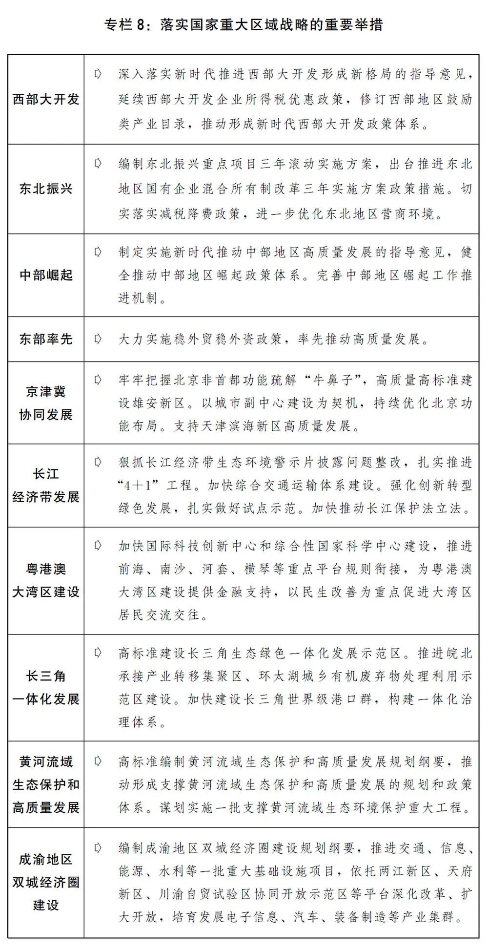 一是落實(shí)落細(xì)重大區(qū)域發(fā)展戰(zhàn)略。落實(shí)區(qū)域協(xié)調(diào)發(fā)展新機(jī)制,持續(xù)推進(jìn)西部大開發(fā)形成新格局,支持東北地區(qū)全面振興全方位振興,健全中部地區(qū)崛起政策體系和工作機(jī)制,繼續(xù)推動(dòng)?xùn)|部地區(qū)率先發(fā)展。縱深推進(jìn)京津冀協(xié)同發(fā)展,加快實(shí)施雄安新區(qū)重點(diǎn)建設(shè)項(xiàng)目,完善北京非首都功能疏解政策體系。大力推進(jìn)長江經(jīng)濟(jì)帶生態(tài)環(huán)境突出問題整改和系統(tǒng)性保護(hù)修復(fù),加快構(gòu)建綜合交通運(yùn)輸體系,促進(jìn)內(nèi)河船舶改造。推動(dòng)粵港澳大灣區(qū)基礎(chǔ)設(shè)施互聯(lián)互通,有序開展國際科技創(chuàng)新中心建設(shè),加快橫琴、河套等重大合作平臺建設(shè)。高標(biāo)準(zhǔn)建設(shè)長三角生態(tài)綠色一體化示范區(qū),推動(dòng)長三角交通一體化更高質(zhì)量發(fā)展,建設(shè)虹橋國際開放樞紐。抓緊做好黃河流域生態(tài)保護(hù)和高質(zhì)量發(fā)展規(guī)劃綱要編制和出臺實(shí)施工作。大力支持成渝地區(qū)雙城經(jīng)濟(jì)圈建設(shè),打造全國高質(zhì)量發(fā)展的重要增長極。積極推進(jìn)西部陸海新通道建設(shè)。深化對口支援。支持少數(shù)民族和民族地區(qū)加快發(fā)展。推動(dòng)國家級新區(qū)、開發(fā)區(qū)等功能平臺創(chuàng)新提升發(fā)展,加快推進(jìn)資源型地區(qū)經(jīng)濟(jì)轉(zhuǎn)型和老工業(yè)城市更新改造。推動(dòng)山西開展能源革命綜合改革試點(diǎn)。繼續(xù)推進(jìn)承接產(chǎn)業(yè)轉(zhuǎn)移示范區(qū)建設(shè),在具備條件的內(nèi)陸城市打造一批高端制造業(yè)基地。制定發(fā)展海洋經(jīng)濟(jì)加快建設(shè)海洋強(qiáng)國的意見。完善主體功能區(qū)戰(zhàn)略和制度,編制《全國國土空間規(guī)劃綱要(2021-2035)》。