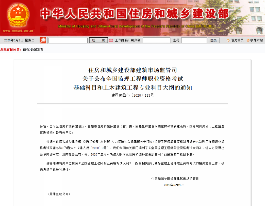 最新!住建部公布2020年全國監(jiān)理工程師職業(yè)資格考試大綱【附全文件】